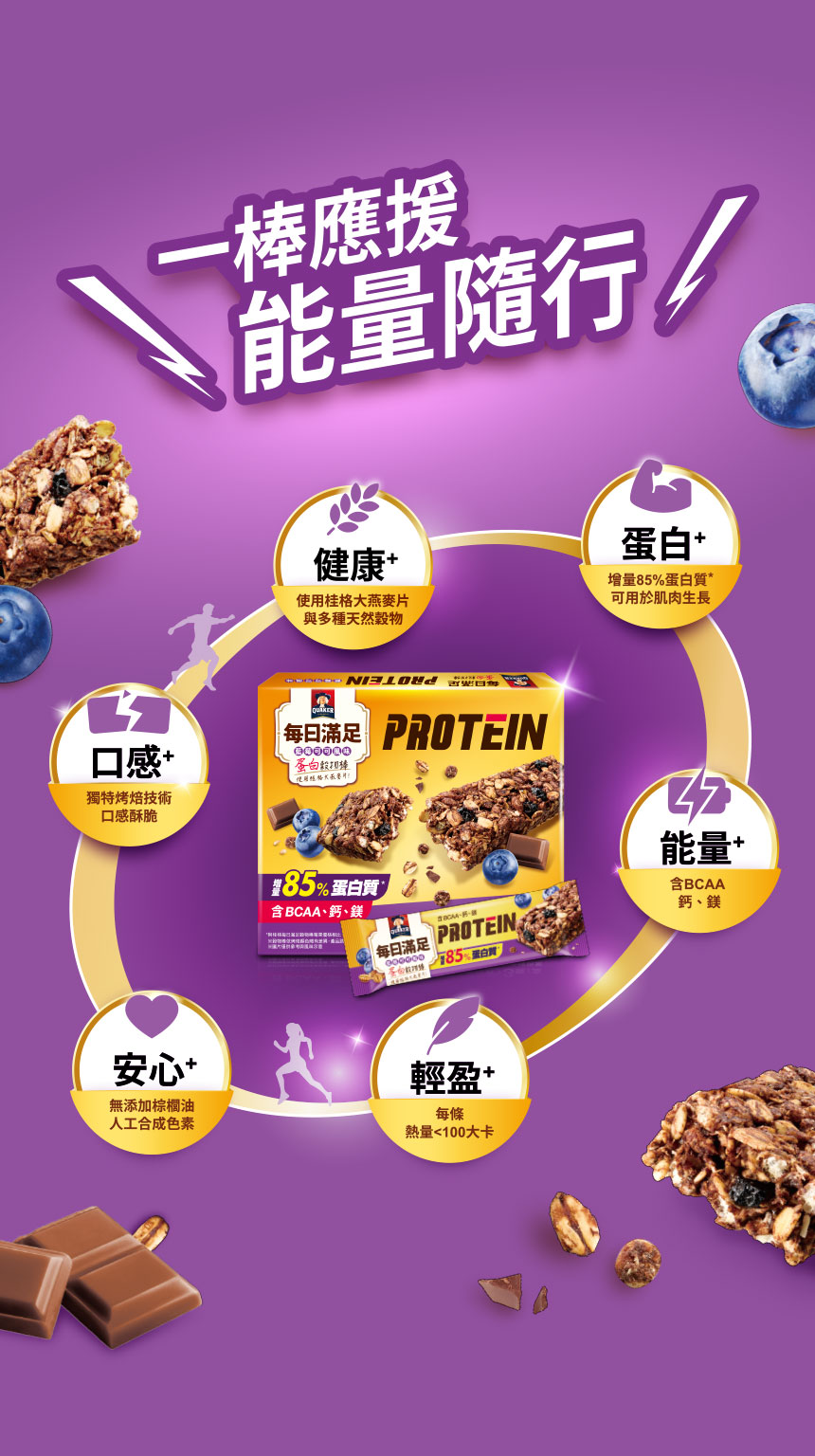 *與桂格每日滿足穀物棒莓果優格相比﹐每100公克蛋白質含量增量85%