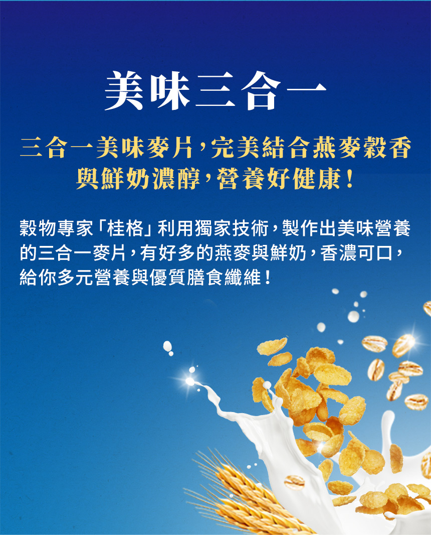 #鮮奶麥片 #營養美味 #膳食纖維 #高鈣 #穀物營養 #三合一 #銷售第一 #麥香 #減糖 #金黃穀香 #陽光麥香