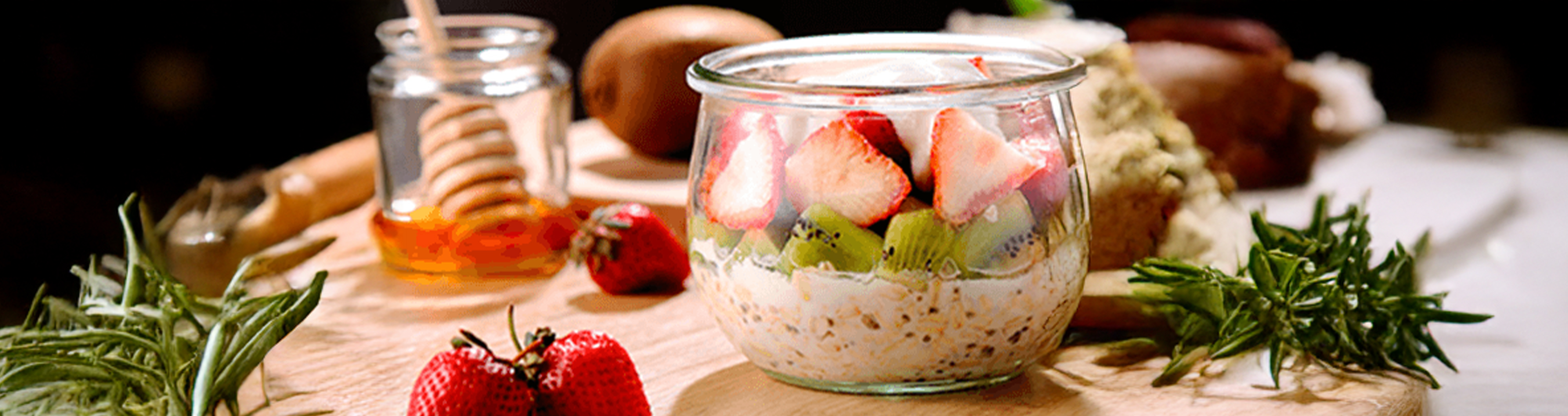 1.準備一個有蓋子的容器,依序放入燕麥片、鮮奶、奇亞籽、蜂蜜、奇異果丁、優格、草莓片。